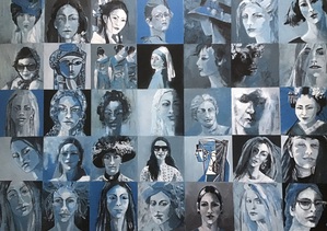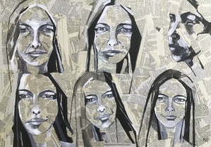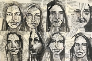2022Paneel beplakt met krantenpapier en daar zijn de portretjes op geschilderd met inkt en witt verf